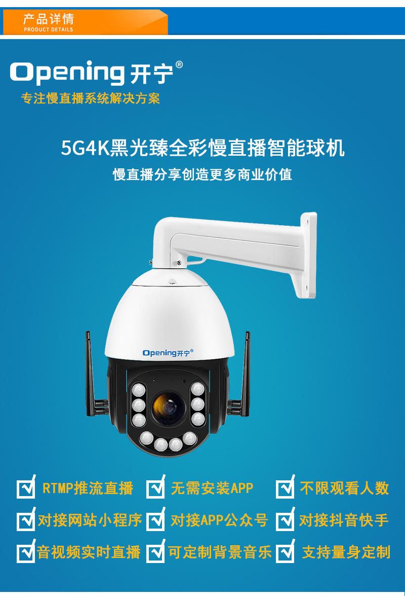 - 1、4K800万6寸5G 20倍黑光臻全彩慢直播智能高清球机,一个球机就是一套慢直播系统;支持360度旋转,支持预置点和巡航,20倍光学变焦,半金属外观,IP66防水等级;