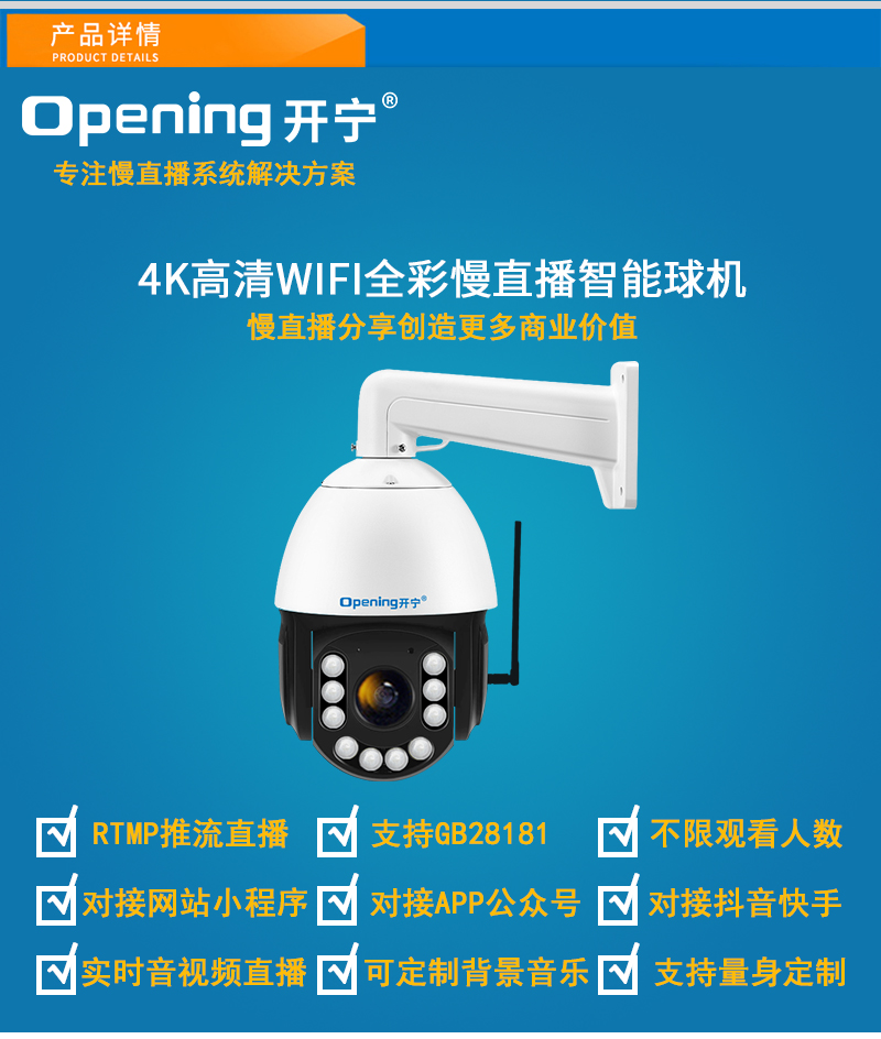 - 1、4K800万6寸WIFI全彩慢直播智能高清球机,一个球机就是一套慢直播系统;支持360度旋转,支持预置点和巡航,20倍光学变焦,半金属外观,IP66防水等级;