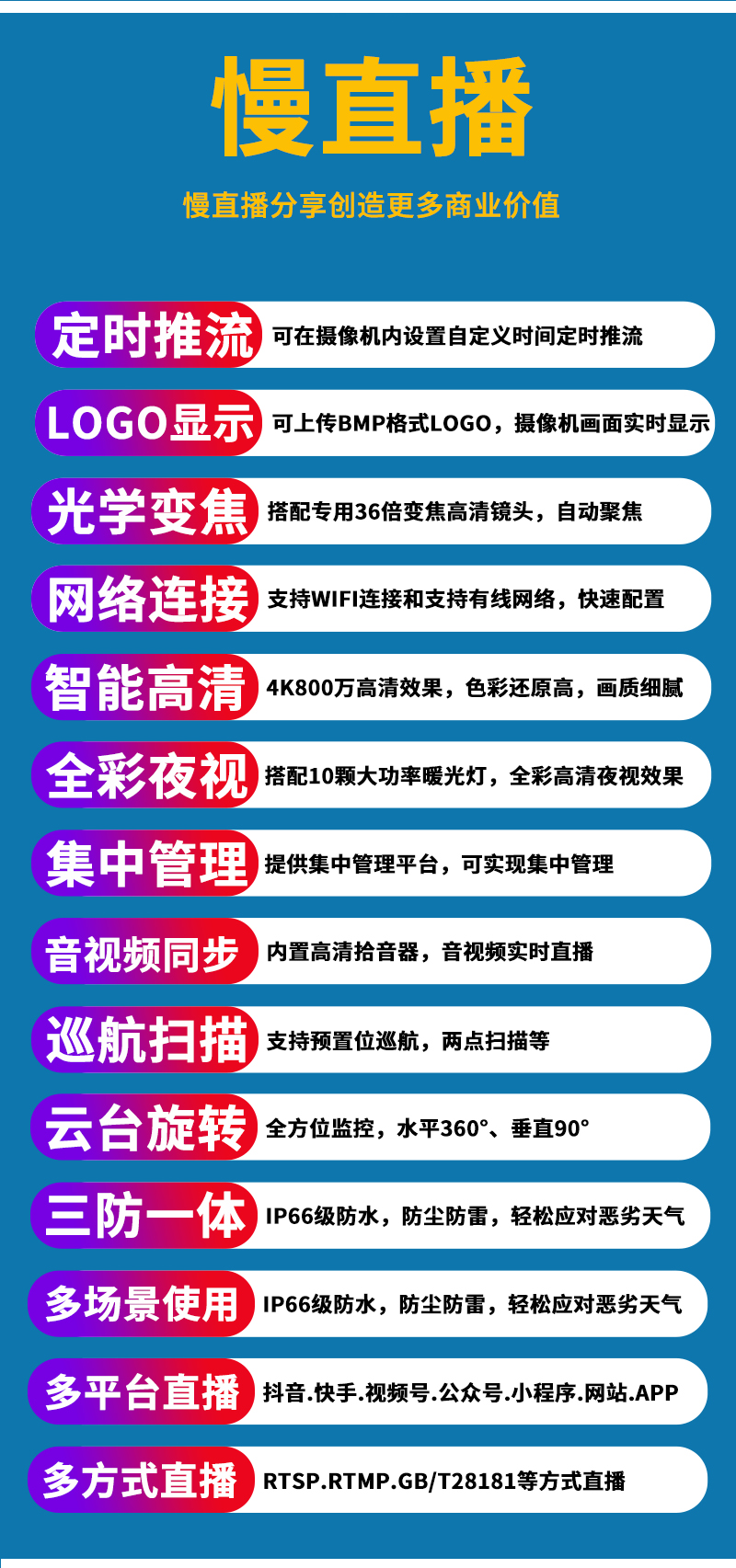 3、不仅可以监控录像,还可以实时慢直播分享创造更多商业价值;